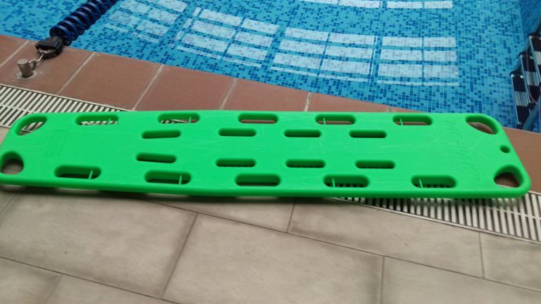 浮水擔架是一塊堅硬的長板,主要使用於懷疑脊椎有創傷的病患身上,其目的為固定病患脊椎使其成一直線,避免於搬運或救護過程移動而造成二度傷害,其具有浮水、分泌物不易滲入中、易於消毒等功能。